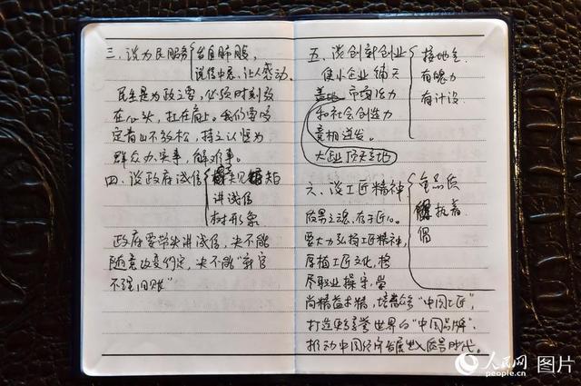 这是全国人大代表李桂杰的参会笔记。李桂杰代表是渤海船舶职业学院基础部教授,她的笔记中写到“政府要带头讲诚信,决不能随意改变约定,决不能‘新官不理旧账’。”人民网记者翁奇羽 摄