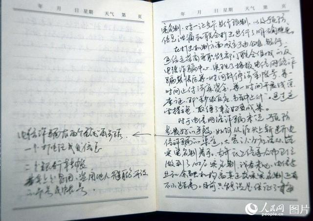 这是全国人大代表周俊军的参会笔记。周俊军是江西省瑞昌市公安局赛湖派出所教导员,他的笔记上写满了如何预防电信网络诈骗的谏言。其中有一页写到“对于电信网络诈骗俩说预防是最好的手段,如何从源头斩断电信诈骗的渠道,大家认为应该从落实实名制着手”。他特意在“预防是最好的手段”后面用引线勾出电信诈骗的特点和步骤。人民网记者秦海峰 摄