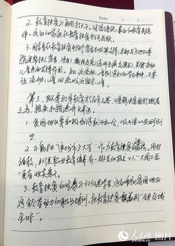 这是全国政协委员何友的参会笔记。何友委员是海军航空工程学院原院长,他关注的是教育扶贫,他在笔记上写到“教育帮扶不能包打天下,对孩子来说,最好的教育是陪伴,良好的家庭在教育扶贫中不可或缺。”人民网记者罗旭 摄