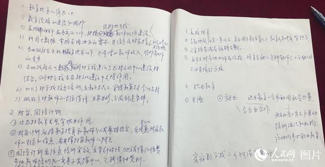 这是全国政协委员章义和的参会笔记。章义和委员是华东师范大学历史系教授,他关注的是教育扶贫问题,他的笔上写到要“利用大数据掌握贫困地区的需求,并给予及时支持。当地政府应该重视教育扶贫工作,尽量增加教师的收入维护教师的尊严。”人民网记者罗旭 摄