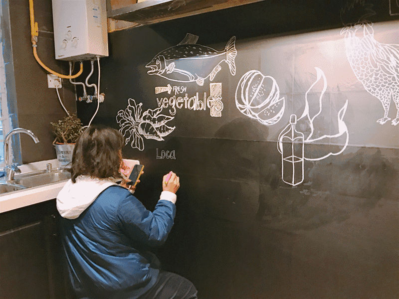 女生就在墙上写写画画,原本单调的墙面立刻就生动了起来~