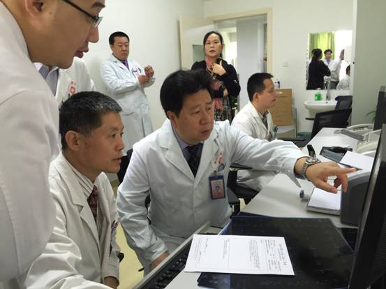 胸外科主任王建军(右二)与执行主任陈开林(左二)查看病历