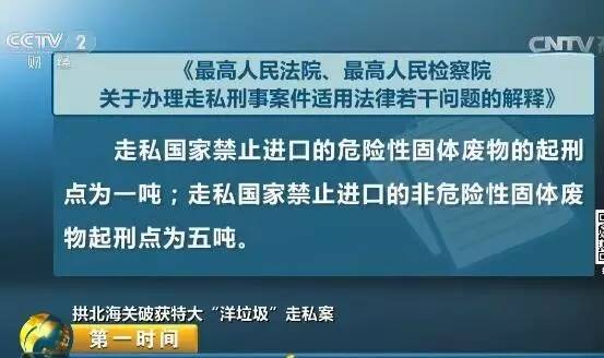 赵民介绍说,犯罪嫌疑人已经触犯了我国《刑法》第152条的规定:走私废物罪。根据《最高人民法院、最高人民检察院关于办理走私刑事案件适用法律若干问题的解释》,走私国家禁止进口的危险性固体废物的起刑点为一吨;走私国家禁止进口的非危险性固体废物起刑点为五吨。