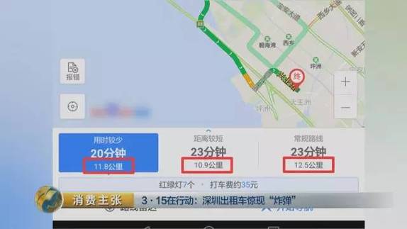 央视财经记者从深圳机场出口的出租车候车区返回到宝安区的兴业路,手机导航软件同样给出了三条行车线路,不过,行车距离都有所减少,分别是11.8公里、10.9公里和12.5公里。