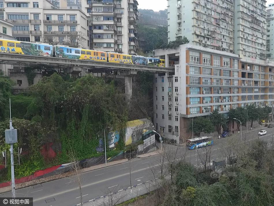 2017年3月18日,重庆,轻轨2号线在李子坝站“穿”居民楼而过,山城的复杂地形造就了全国绝无仅有的震撼景象。图片来源:视觉中国