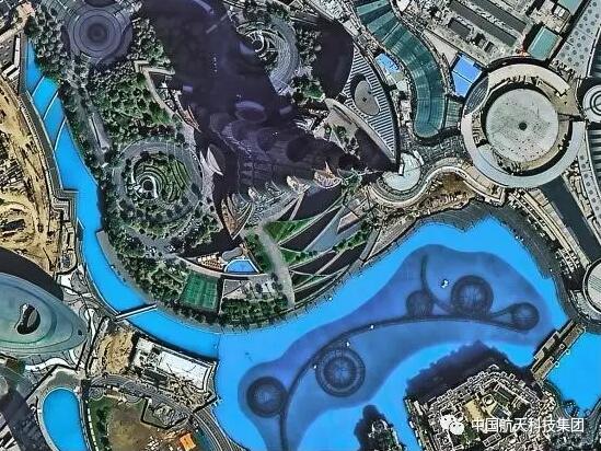 图为世界第一高楼与人工构造物迪拜哈利法塔,塔身自下向上层层叠砌,塔尖直指云霄,塔底水中设施一览无遗。