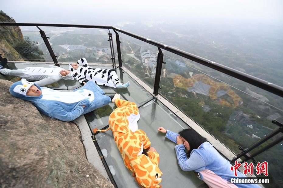 3月21日,正值世界睡眠日,游人身着卡通睡衣躺在湖南平江石牛寨的悬崖玻璃栈道上,摆出各种睡姿享受睡眠,以此行为艺术呼吁关注睡眠健康。杨华峰 摄