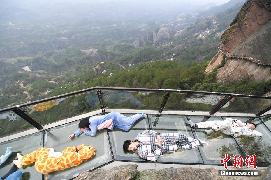3月21日,正值世界睡眠日,游人身着卡通睡衣躺在湖南平江石牛寨的悬崖玻璃栈道上,摆出各种睡姿享受睡眠,以此行为艺术呼吁关注睡眠健康。杨华峰 摄
