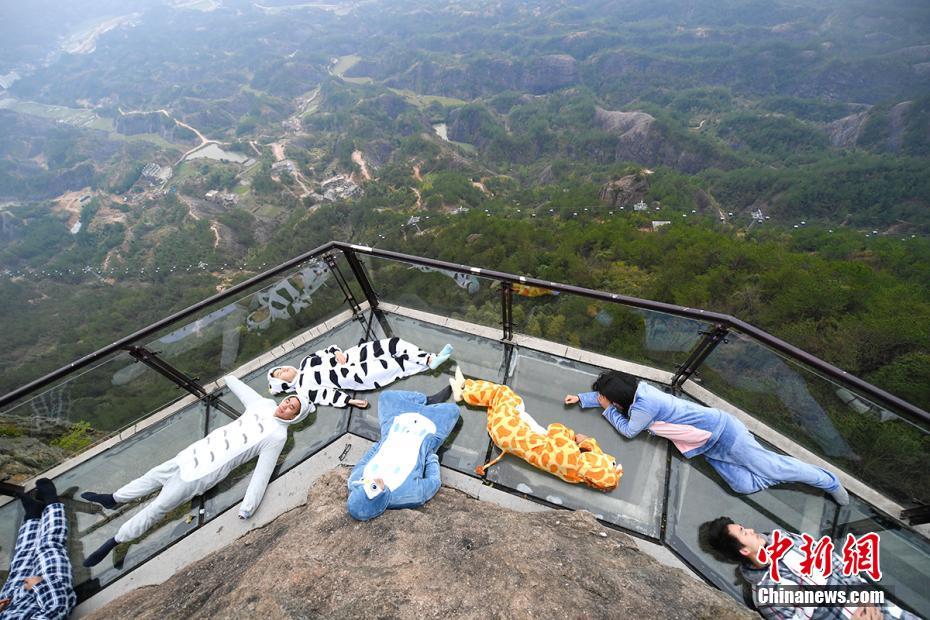 3月21日,正值世界睡眠日,游人身着卡通睡衣躺在湖南平江石牛寨的悬崖玻璃栈道上,摆出各种睡姿享受睡眠,以此行为艺术呼吁关注睡眠健康。杨华峰 摄