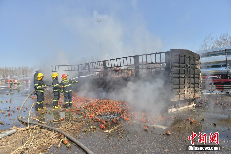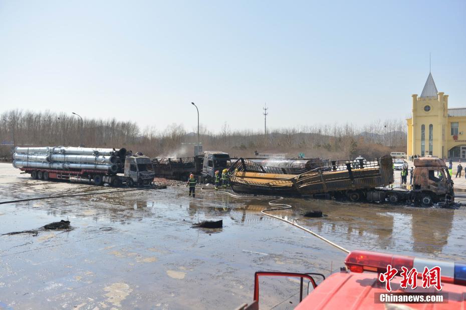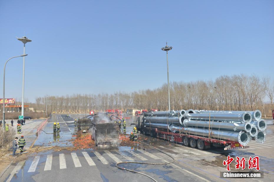3月21日,辽宁省葫芦岛市,消防官兵正在现场救火。当日,京哈高速辽宁省葫芦岛市兴城服务区内发生一起四车相撞起火事故,其中一辆为装有30吨双氧水的罐车。现场火势猛烈,经消防官兵近一个小时扑救,火势得到控制。事故导致两人死亡。中新社记者 钟欣 摄