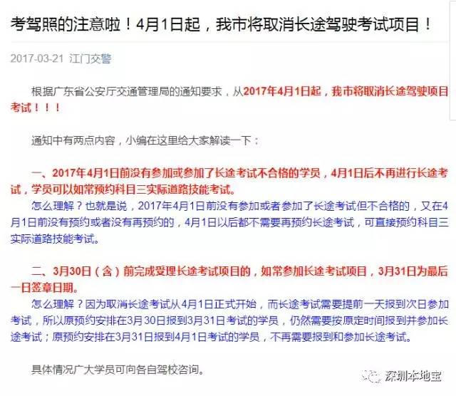 2017年4月1日前没有参加或参加了长途考试不合格的学员,4月1日后不再进行长途考试,学员可以如常预约科目三实际道路技能考试;