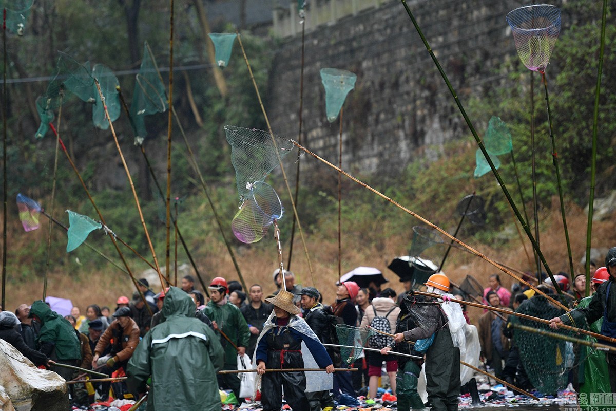 2017年3月22日,即农历的春社日(立春后第5个戊日),四川省绵阳市雎水镇境内的一座200年历史的古桥热闹非凡,当地10余万人纷纷到此参加一年一度的“春社踩桥”盛会。祈福人群走到古桥上,将一些破旧衣物、零钱从桥上扔下,寓意扫去一年颓废,免去灾难。而在桥下,便有一群捞金者手持套上网兜的竹竿等候着,不断将从桥上掉下的钱币接到网中。莫晓/视觉中国