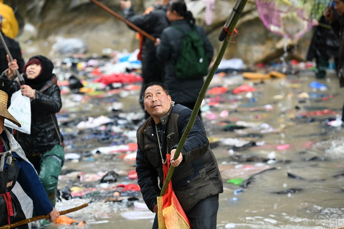 2017年3月22日,即农历的春社日(立春后第5个戊日),四川省绵阳市雎水镇境内的一座200年历史的古桥热闹非凡,当地10余万人纷纷到此参加一年一度的“春社踩桥”盛会。祈福人群走到古桥上,将一些破旧衣物、零钱从桥上扔下,寓意扫去一年颓废,免去灾难。而在桥下,便有一群捞金者手持套上网兜的竹竿等候着,不断将从桥上掉下的钱币接到网中。莫晓/视觉中国