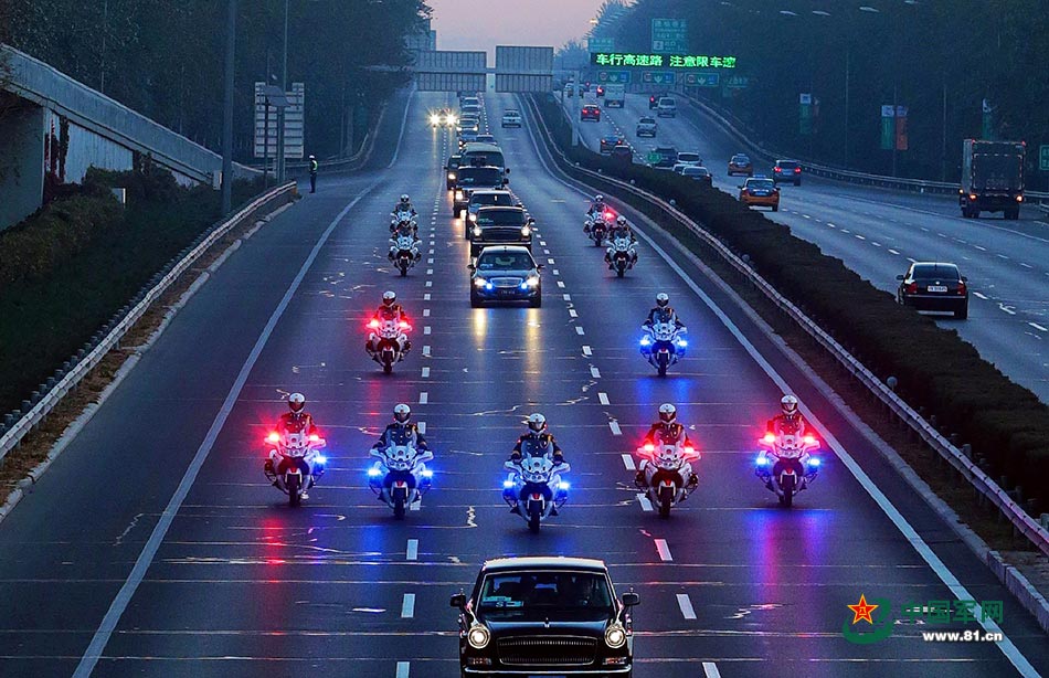 国宾护卫队员护卫着国宾行进在机场高速路上。特约记者李光印 摄