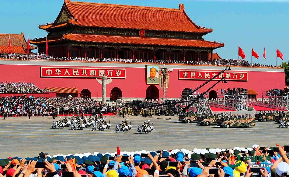 2015年9月3日,武警国宾护卫队员护卫抗战老战士车队率先通过天安门。特约记者李光印 摄