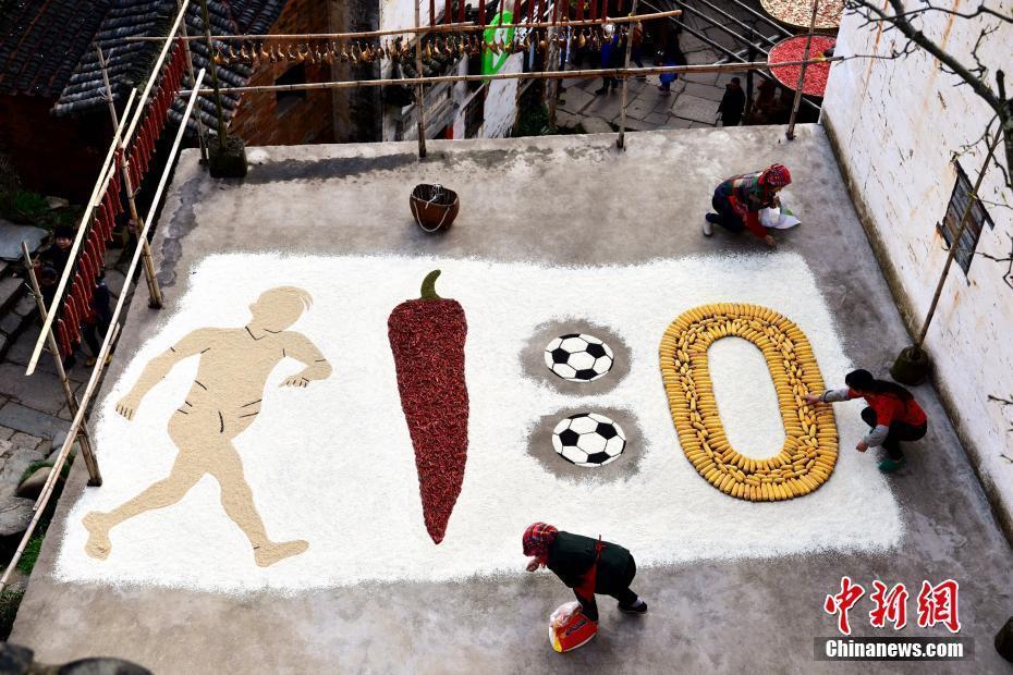 3月25日,江西省婺源县篁岭古村晒秋大妈用大米、黄米、黑芝麻、辣椒、玉米、荞麦拼出一幅5米见方的“1:0”比分造型,用自己独特的方式庆贺国足收获12强赛首胜,引来众多球迷合影留念。两天前,中国男足国家队在世界杯预选赛亚洲区十二强赛当中力克韩国队。曹加祥摄