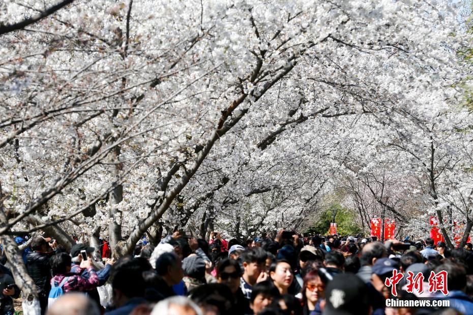 3月27日,北京天气晴好,玉渊潭公园盛开的樱花吸引了众多游客赏花踏青,百米樱花大道上游人如织。 中新社记者 杜洋 摄