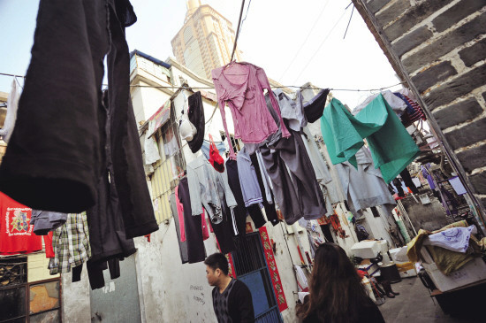 瓦房之间到处可见乱拉的电线,一些电线已经裸露出里面的金属。住户把衣服晾在电线旁边,一些衣服还在滴水,与电线相隔不到10厘米。