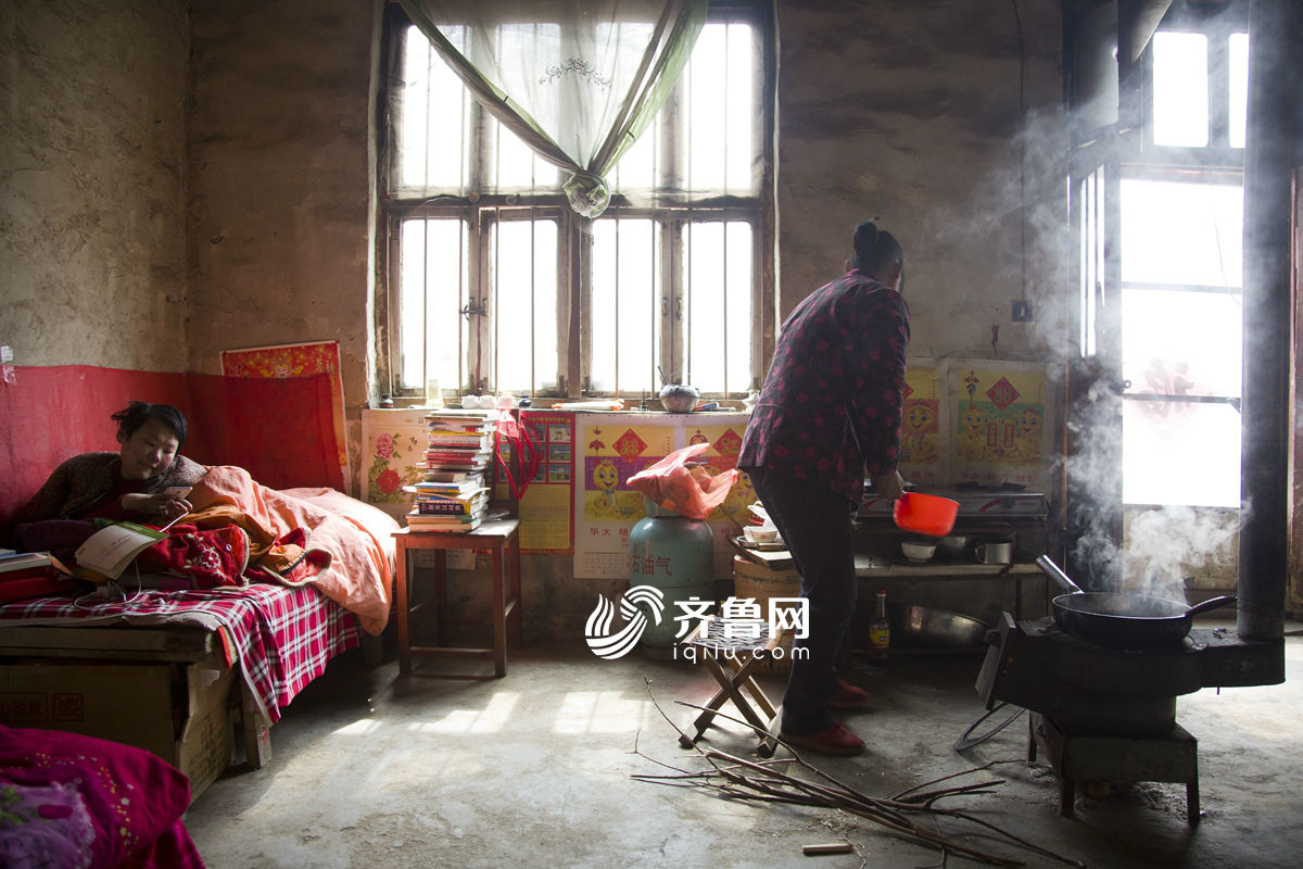 图为妈妈做饭,元靖读书。妈妈说,虽然患有严重的腰椎间盘突出,但还是要照顾好残疾女儿,毕竟是身上掉下的一块肉。齐鲁网记者孙长征 实习记者 祁效媛