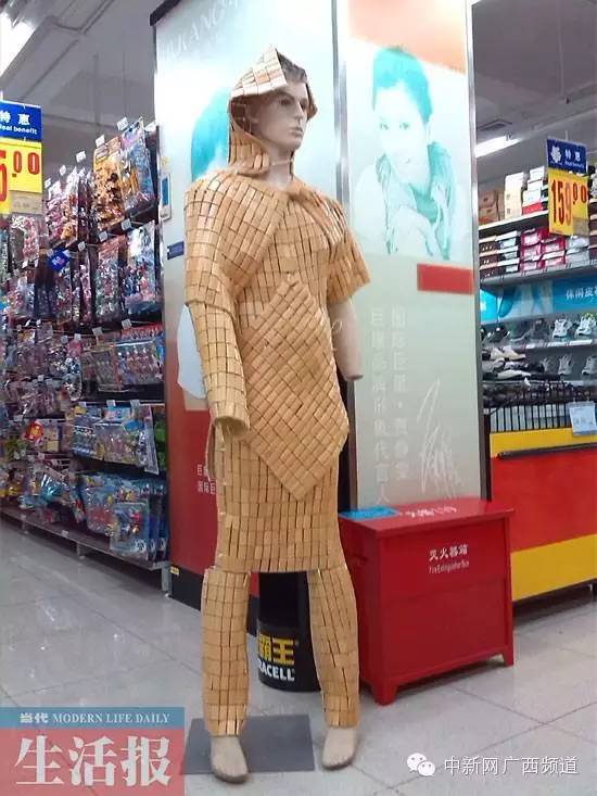2013年8月,南宁民主新民路口一超市内,惊现一个高大的“铠甲人”。超市工作人员小李说,“用凉席给模特穿上铠甲”是她的主意。(当代生活报)
