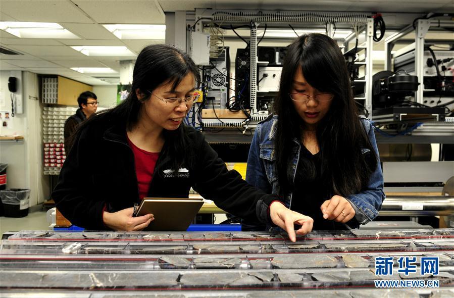 IODP367航次中方首席科学家孙珍(左)和来自中科院南海海洋研究所的张翠梅在“决心”号上观察研究钻取到的玄武岩(4月2日摄)。我国科学家主导的第三次南海大洋钻探在南海北部海域顺利进行。截至目前,在IODP367航次第二个钻探站位,“决心”号插入南海海底的“探海神针”已超过1500米,这一钻井深度在国际大洋钻探历史上达到全球第七。新华社记者张建松 摄