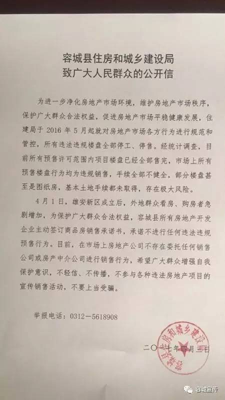 从4月1日下午开始,雄县、容城、安新三个县城的一举一动,都开始备受外界关注。4月2日,雄县召开紧急会议,要求停止一切售楼行为。3日,容城县住建局发布公开信:目前所有预售许可范围内项目楼盘已经全部售完,市场上所有预售楼盘行为均为违规销售。