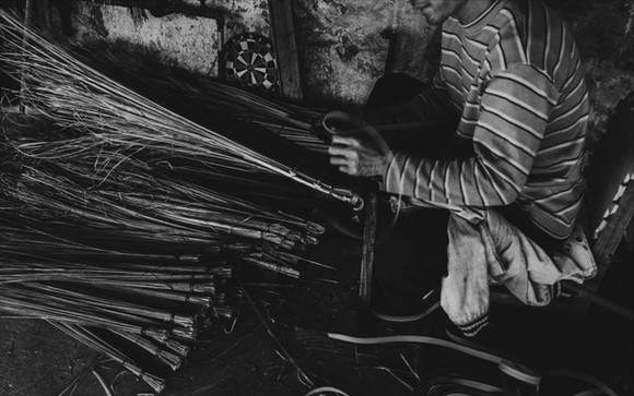 一名年轻男子坐在昏暗的屋檐下,用干稻草编织着扫帚,动作娴熟。