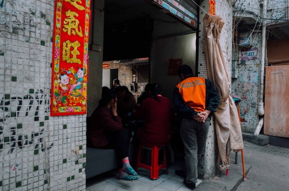 每一个城中村惯有的另一门手艺:打麻将。洗牌,麻牌,抓牌,糊!一连串搓麻将的声音不时传入耳边,响遍街头巷尾。