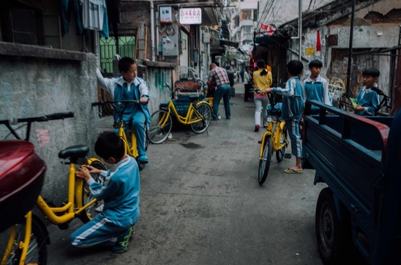 小学生们骑着共享单车停在村口,聚在一起聊聊今天发生的趣事或者聊聊今天的功课应该怎么做。