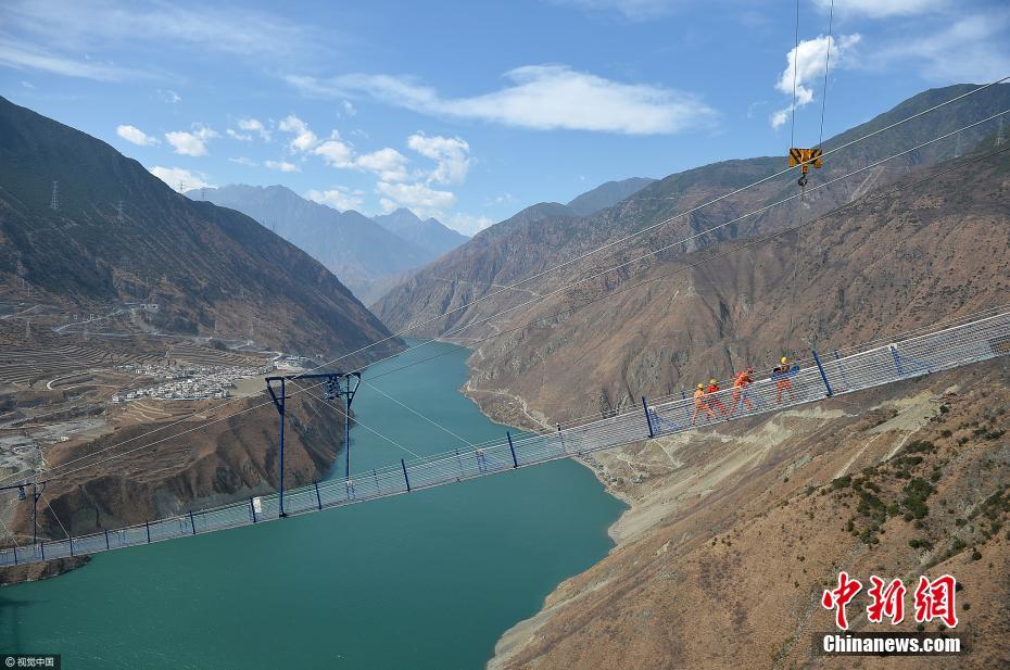 4月6日消息,四川甘孜。泸定大渡河平静如镜,两台巨大的牵引卷扬机分别矗立在两岸,牵引着钢丝桥索飞跨1100米,牵起两岸的索塔。被誉为“川藏第一桥”的雅康高速泸定大渡河兴康特大桥4月5日开始架设首根主缆,预计2018年8月底建成贯通。该桥为双向四车道,设计时速80公里。王勤 摄