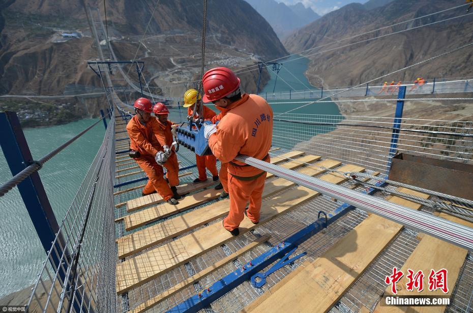 大桥位于大渡河峡谷之中,瞬间风速能达到32.6米/秒,相当于12级台风。只要风速超过6级,工人便停止施工。在猫道上,工人们正利用拽拉器把索股吊起来。什么是索股?原来,全桥有两根主缆,单根主缆有187股,这每一股就叫索股。而每根索股又由91根高强度镀锌钢丝组成。据介绍,全桥主缆共有钢丝34034根,总长度超6万公里,连起来可绕地球一圈半。王勤 摄 文字来源:成都商报 图片来源:视觉中国