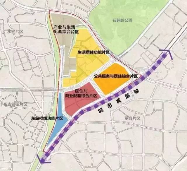 城市功能发展轴——依托轨道交通3号线的布吉站和木棉湾站,沿龙岗大道,布置商业办公、公共服务、居住配套等城市功能,构建龙岗大道城市功能主轴线;