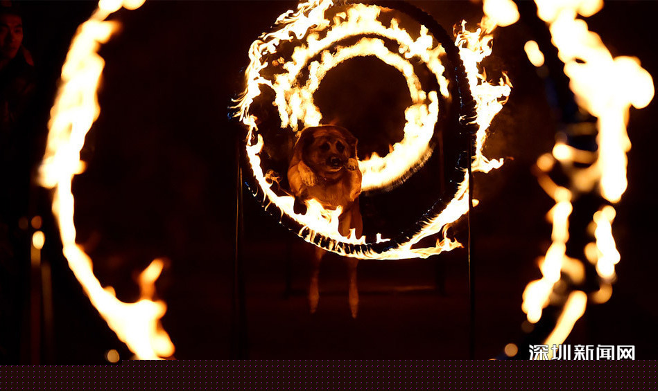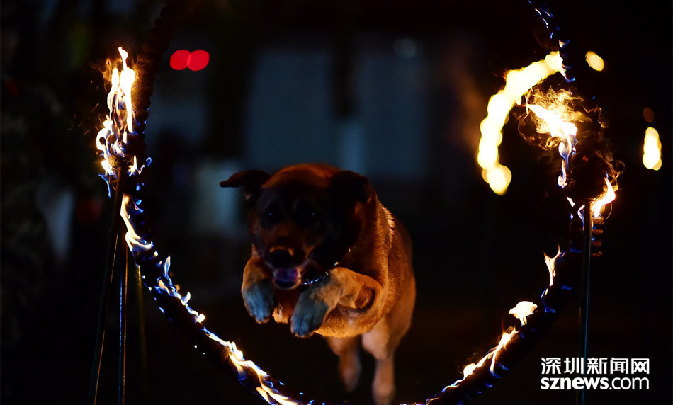 仗怎么打,兵就怎么练。4月6日凌晨,位于深圳梅林山边防警犬训练基地里灯火通明,武警广东省边防总队机动支队十二中队正在如火如荼开展警犬课目夜训,只见扑咬训练直接把训导员后背衣服抓破、飞身跳跃火圈如科幻动作大片、杂物房里搜毒、搜爆一搜一个准,“练兵即打仗”的氛围扑面而来。中队长曾云强介绍:这批犬里有刚从全省警犬考核归来的冠军犬,有的是在重大专项安保中搜出雷管的功勋犬,均有着丰富的实战经验;但随着警犬担负的缉私、缉毒、搜爆等任务越来越多出现在夜里,所以部队根据实战需要开展夜训。图为警犬穿越多重火圈训练。(广东边防)