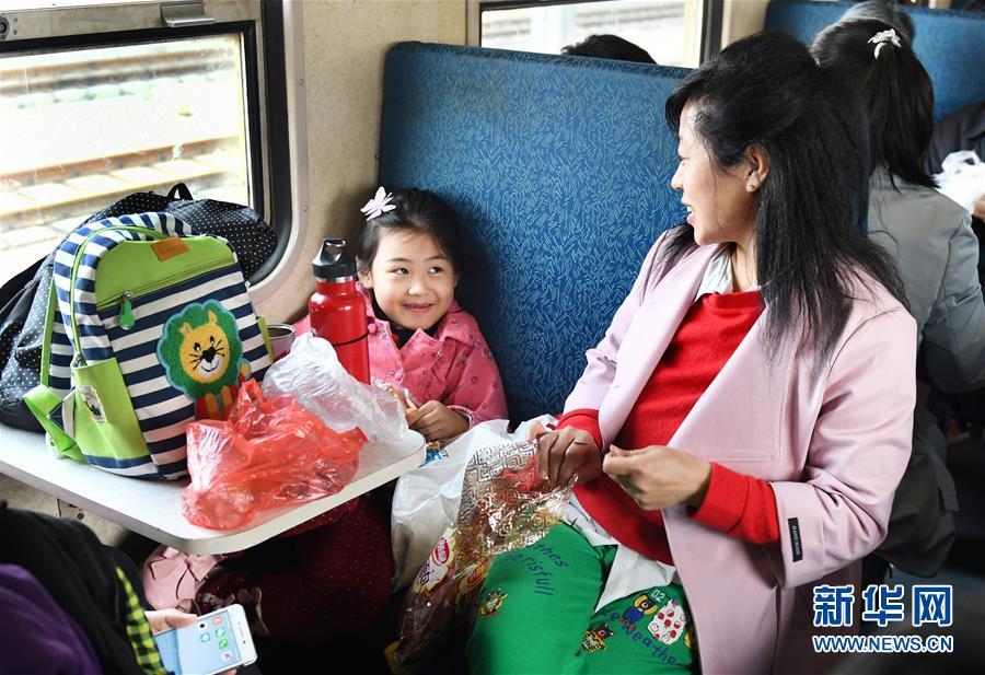 4月9日,一对母女乘坐天津—涉县4481次列车。新华社发(杨宝森 摄)