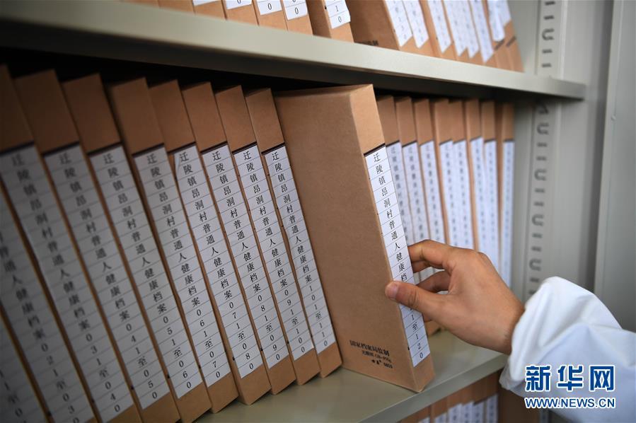 昂洞卫生院医生张俊林在资料室整理村民健康档案(4月1日摄)。新华社记者李尕 摄