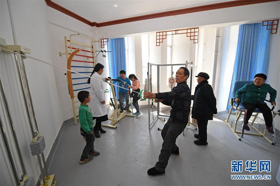 彭秀义老人在昂洞卫生院康复中心使用康复健身器材(4月1日摄)。新华社记者李尕 摄