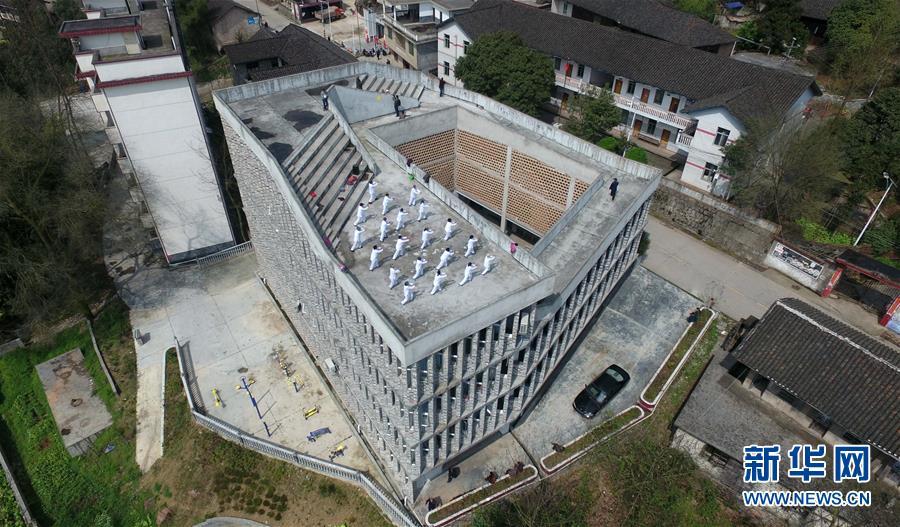 昂洞村的老人在昂洞卫生院楼顶公共活动平台打太极拳(3月31日摄)。新华社记者李尕 摄