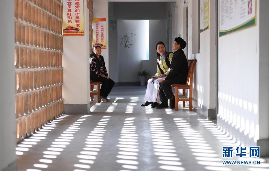 昂洞村的村民坐在昂洞卫生院走廊的长椅上晒太阳聊天(4月1日摄)。新华社记者李尕 摄