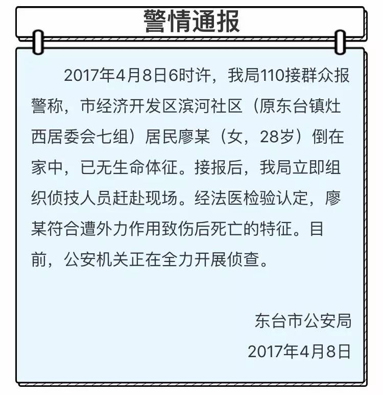 今天凌晨12点,东台市公安局发布了一则最新警情通报:“2017年4月8日6时许,我局110接群众报警称,市经济开发区滨河社区(原东台镇灶西居委会七组)居民廖某(女,28岁)倒在家中,已无生命体征。接报后,我局立即组织侦技人员赶赴现场。经法医检验认定,廖某符合遭外力作用致伤后死亡的特征。目前,公安机关正在全力开展侦查。”