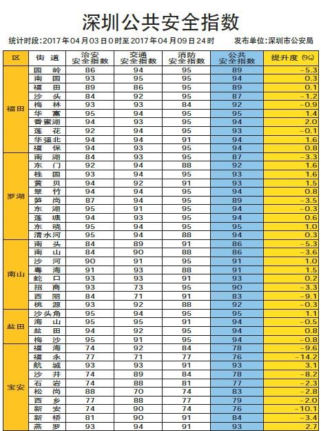 深圳新闻网讯 深圳市公安局围绕市委市政府“城市管理治理年”工作部署要求,借鉴国内其他城市的成功做法,于2016年4月5日开始,每周通过《深圳特区报》、《深圳新闻网》、市公安局门户网站、公安微信、微博,向社会发布一次深圳公共安全指数,保障市民群众知情权、监督权,引导社会各界广泛参与 “平安深圳”建设。