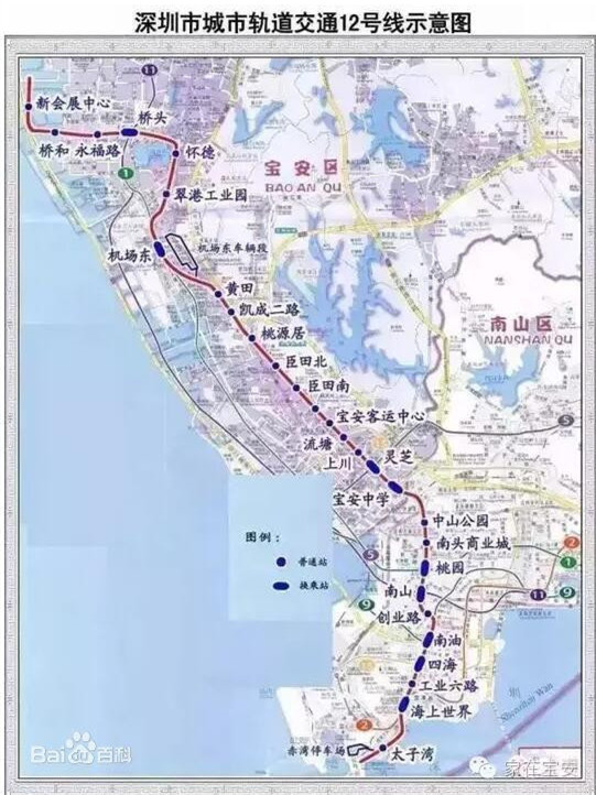 12号线:联系蛇口自贸区、南山中心区、宝安中心、航空城、大空港地区,覆盖西部发展轴的轨道线路。线路起于蛇口左炮台,经太子湾、海上世界、南山中心区、宝安中心区、机场东、大空港等片区,终点设在国际会展中心,预留进一步北延条件。线路全长约36.9公里,设站27座,地下敷设。