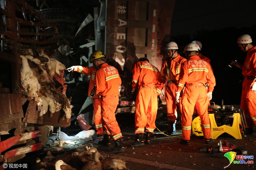 2017年4月10日21时21分,南宁市消防支队指挥中心接到报警:南宁市江南区绕城高速高岭收费站往玉洞方向1公里处发生交通事故,有多人被困。接警后,南宁支队立即调派金凯、体育中心、经开中队共4个抢险编队(3辆抢险救援车,5辆城市主战车)40名官兵赶赴现场处置,支队全勤指挥部遂警出动。