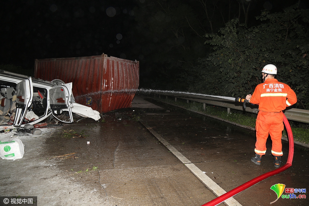 2017年4月10日,南宁市消防支队指挥中心接到报警:南宁市江南区绕城高速高岭收费站往玉洞方向1公里处发生交通事故,有多人被困。图为救援现场。