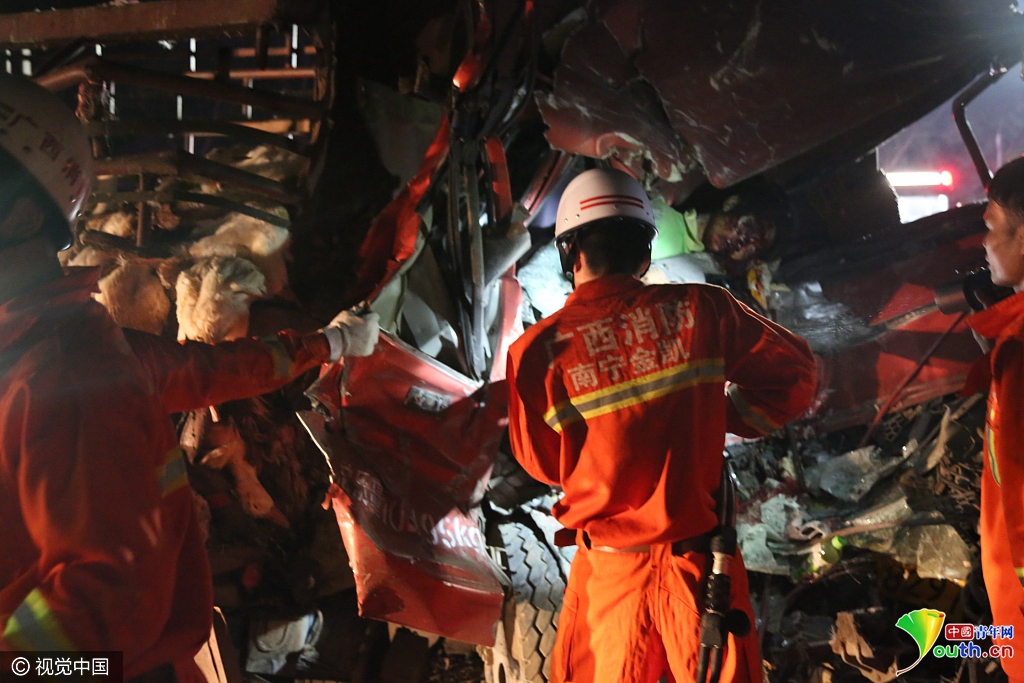 2017年4月10日,南宁市消防支队指挥中心接到报警:南宁市江南区绕城高速高岭收费站往玉洞方向1公里处发生交通事故,有多人被困。图为救援现场。