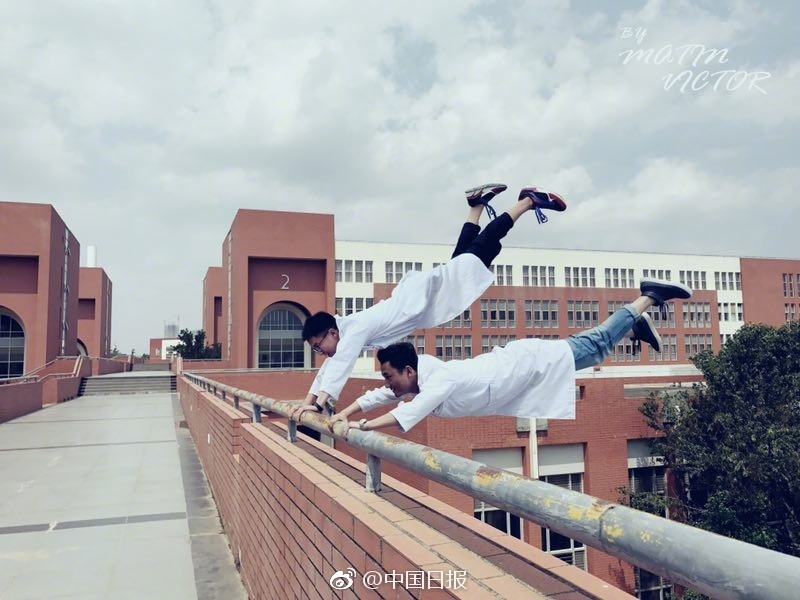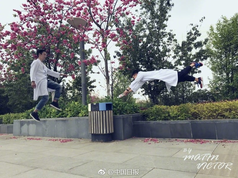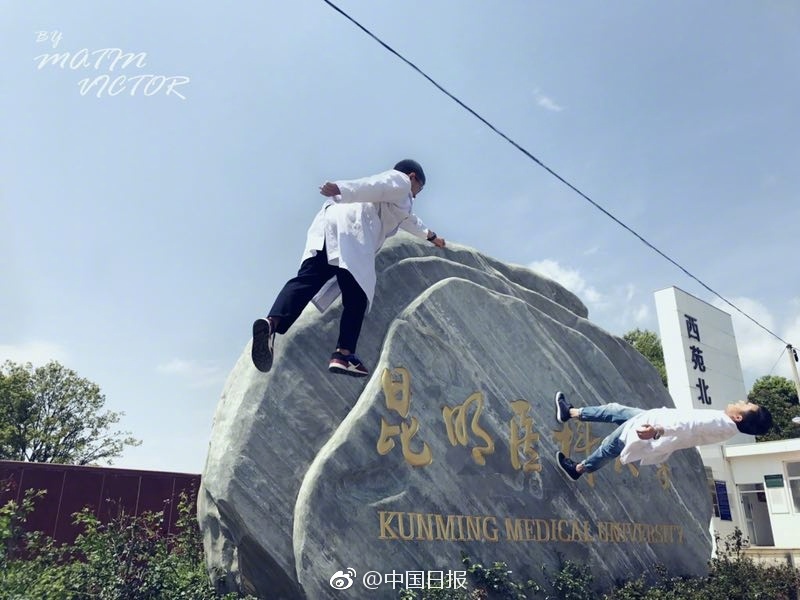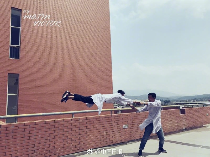 近日,来自昆明医科大学穿白大褂的学生们,在校园内拍摄了一组创意十足的照片。带着对校园的依恋及医学的敬仰,昆明医科大的学生萌生拍摄一组关于校园的照片,他们用独特的角度与别出心裁的创意,玩转悬浮,定格医学美!(记者李映青 摄影 马灯 马应清)来源微博:中国日报