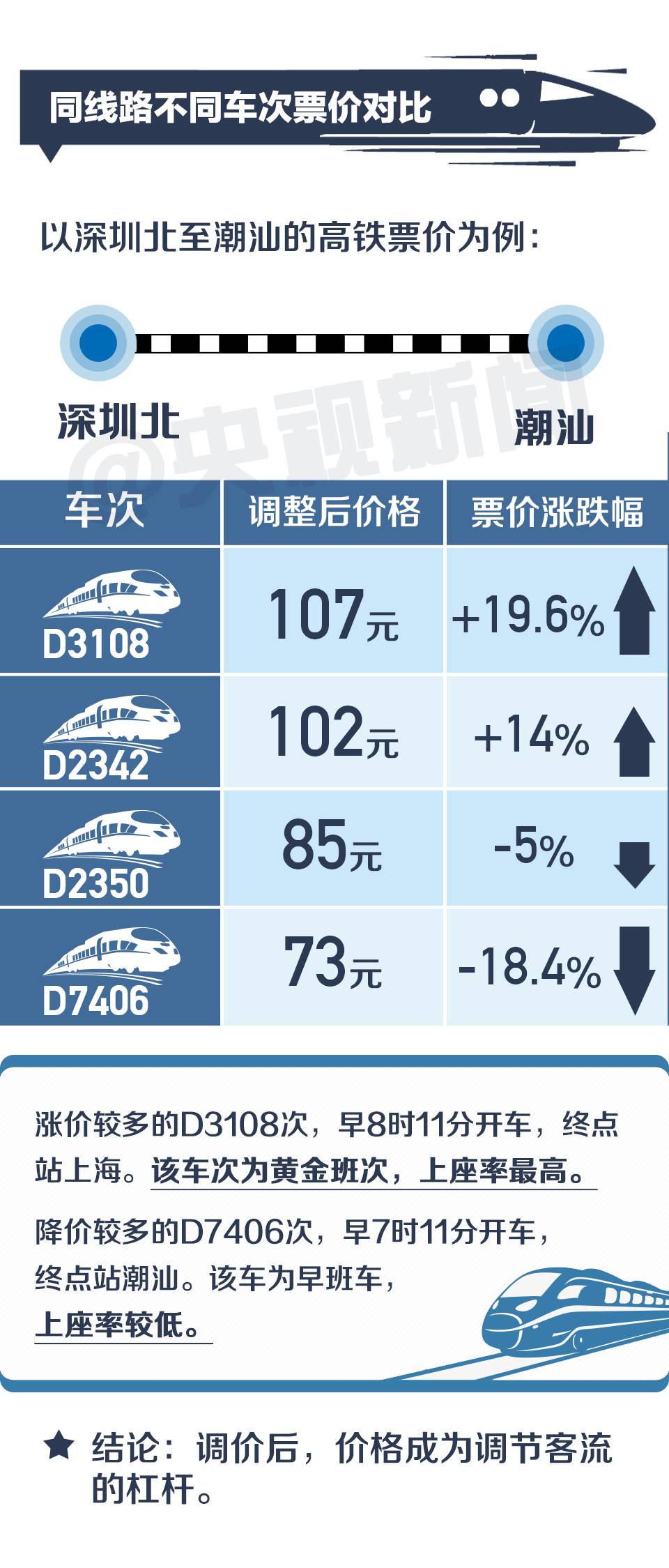 另外,调价也不完全等同于涨价。此次东南沿海高铁调价,执行票价是根据各车次的客流状况呈现差异化,有涨有降。