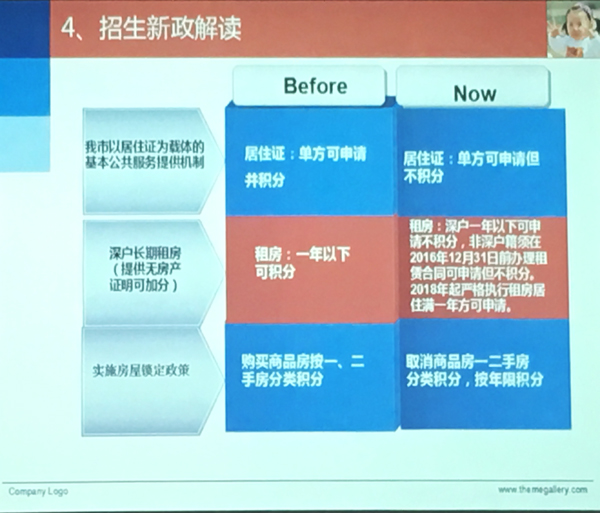 同时,今年招生政策强化了居住证的使用功能,如对居住证的要求是“具有使用功能的《深圳经济特区居住证》”,强化了积分入学的分值内容,如对社保积分的要求是按 “养老保险和医疗保险”同时缴纳计算等。