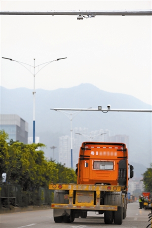 昨日下午14时,记者来到了货车交通繁忙的明珠大道北往南方向的泊郡雅苑路口,周边有很多物流园区,来往的货柜车很多。而深圳交警在针对“乱鸣喇叭”行为启用的首套“声呐电子警察”也正式在现场启用。