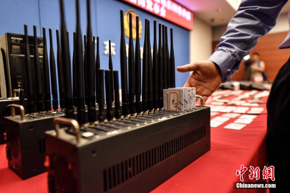 4月18日,广东省警方向媒体介绍涉案猫池。当日,广东省公安厅通报,广东省公安厅组织江门、深圳、惠州等地警方赴湖南、福建等省,对“飓风8号”“飓风9号”两起特大电信网络诈骗专案开展收网行动,成功摧毁多个电信网络诈骗犯罪团伙,查获公民个人信息1600余万条,冻结涉案资金近亿元。中新社记者陈骥旻 摄