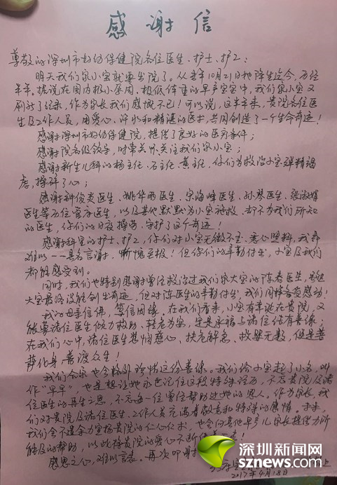 “医者父母心,用爱创造奇迹”,19日上午,“早早”的父母给深圳市妇幼保健院带来一份特殊的礼物——一块感谢牌匾和一份手写感谢信。感谢信中写道,“这半年来,医院各位医生及工作人员用爱心、汗水和精湛的医术,共同创造了一个生命奇迹!”